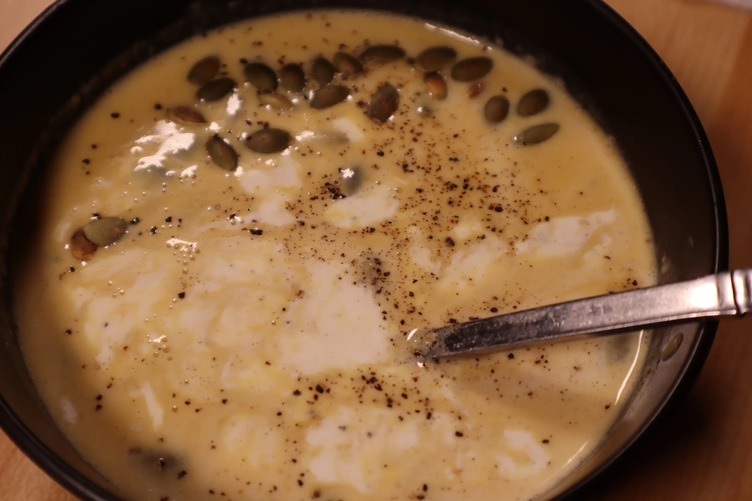Ladle your soup into a serving bowl, add a splash of heavy whipping cream and top with the toasted pepitas and fresh cracked black pepper. Optionally serve alongside toasted bread.