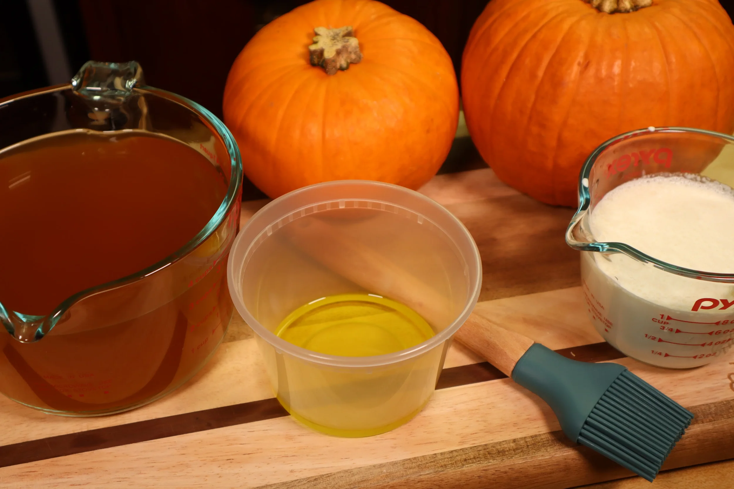 Half the pumpkin(s) and scoop out the seeds using a spoon. Slice the pumpkin halves in half to make quarters. Place the pumpkin quarters on a baking sheet lined with tinfoil. Using a brush, cover the quarters with olive oil making sure to cover everything. Place the pumpkin quarters cut side down and roast until the pumpkin flesh can be poked through with a fork. Then set the pumpkin aside.